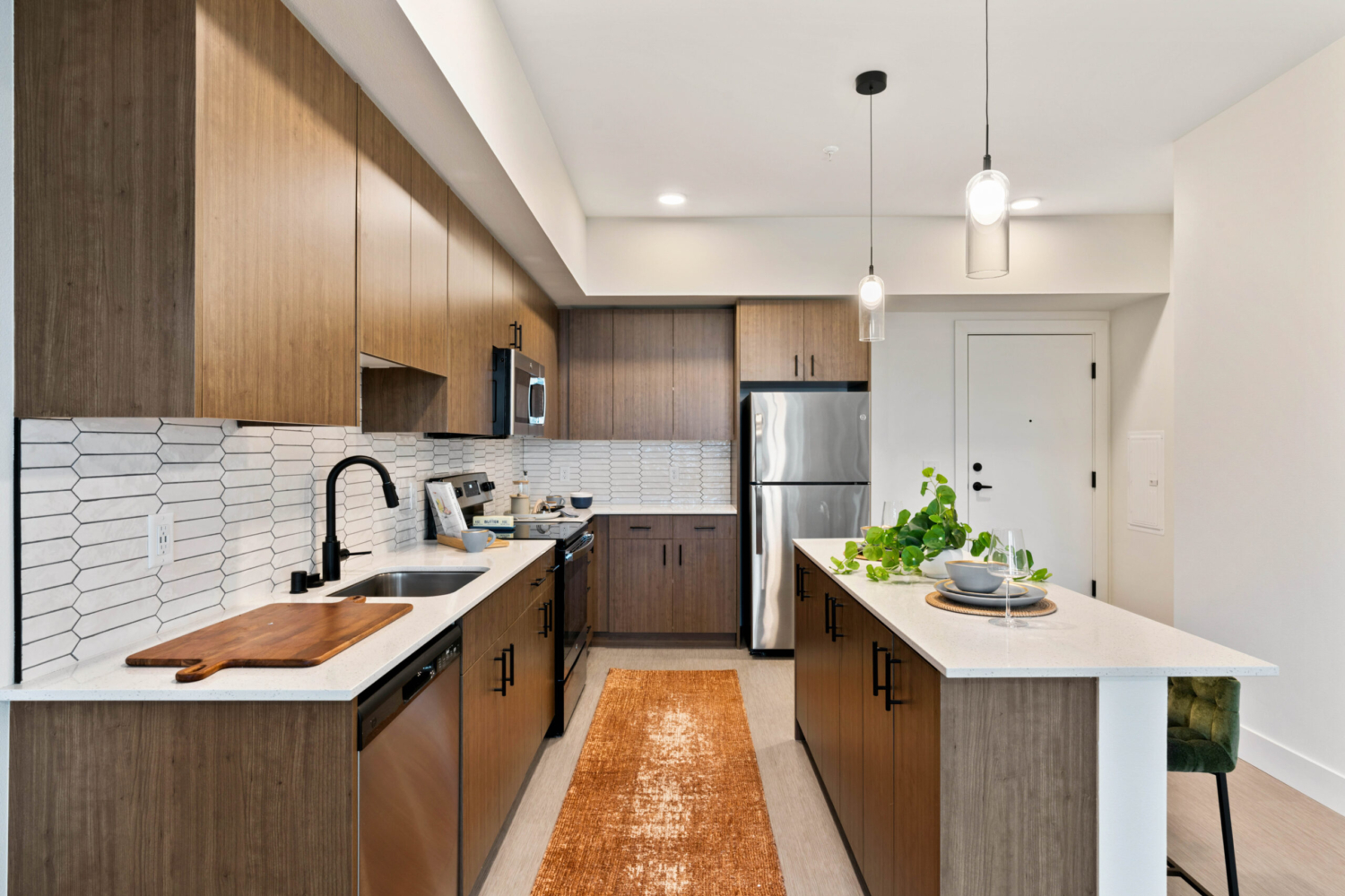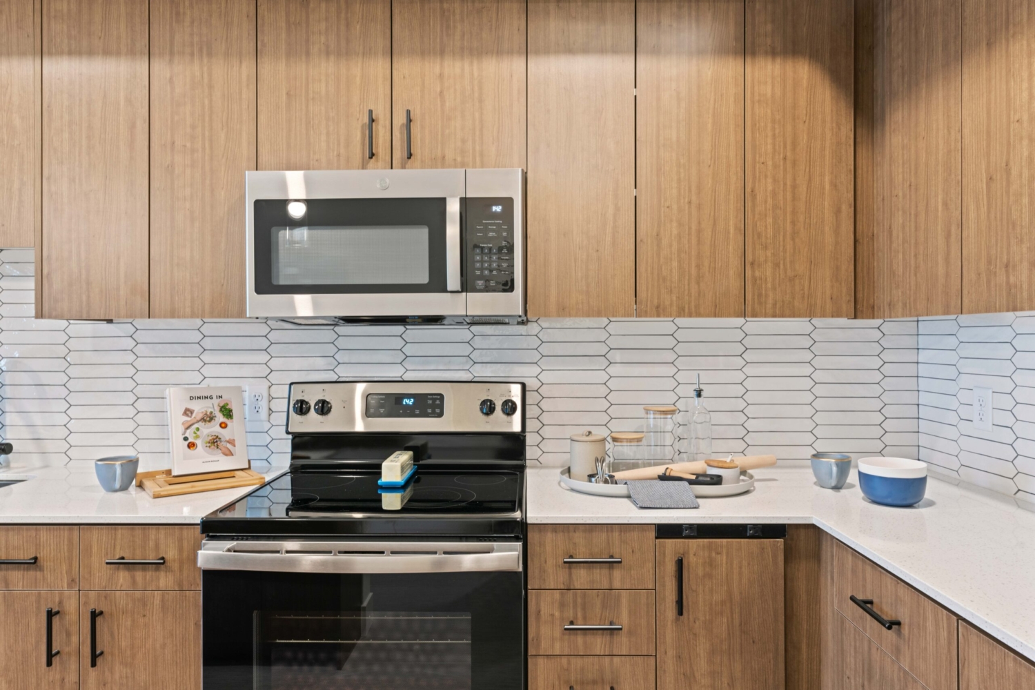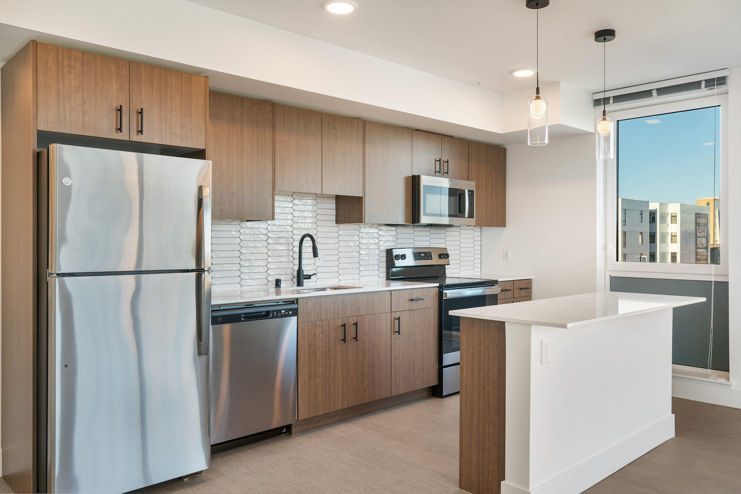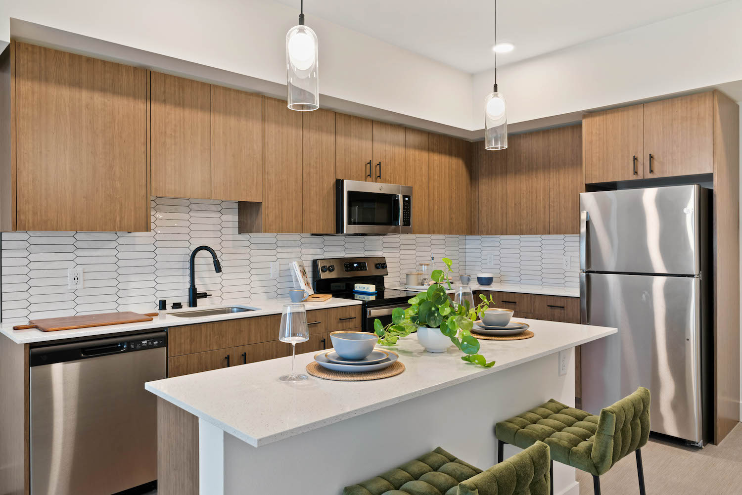 First, take a tour of our stylish and modern apartment interiors, complete with designer light fixtures, soft-close cabinets, stainless steel appliances, quartz countertops, modern tile backsplashes, and matte black accents. You’ll also appreciate the convenience of triple pane tilt-in windows, integrated air conditioning, and luxury vinyl wood-like flooring. And, with a large washer and dryer included in every unit, doing laundry has never been easier.