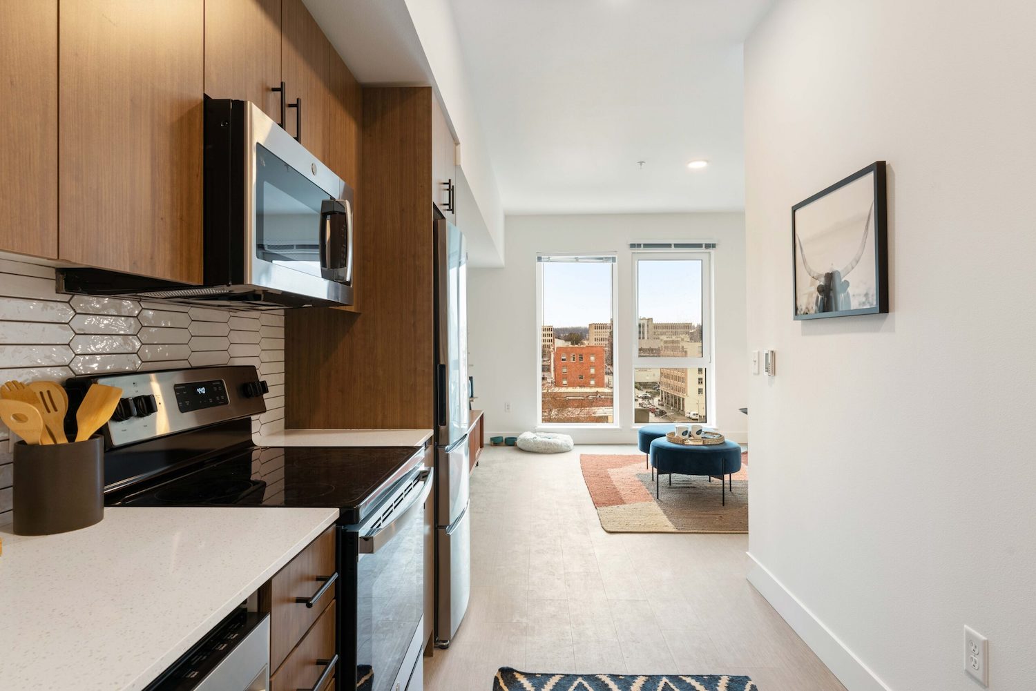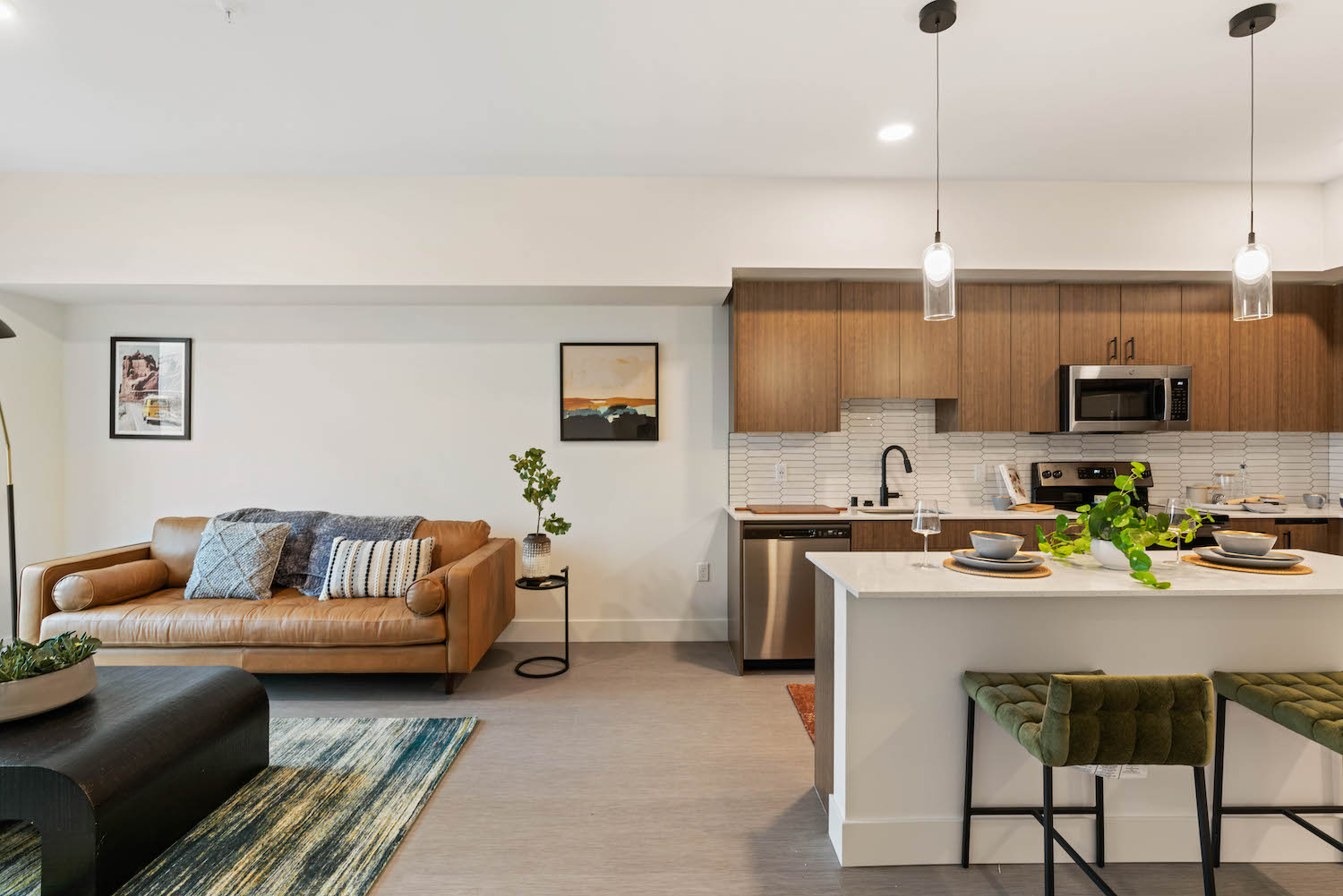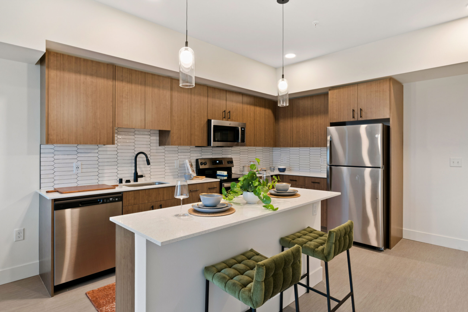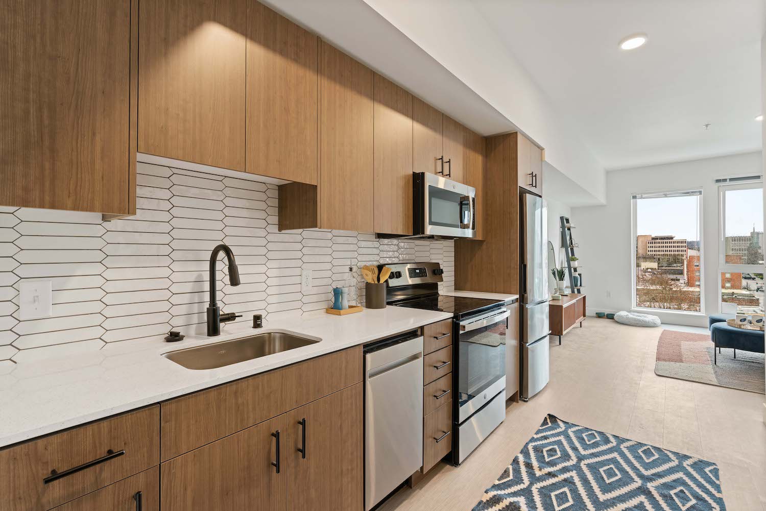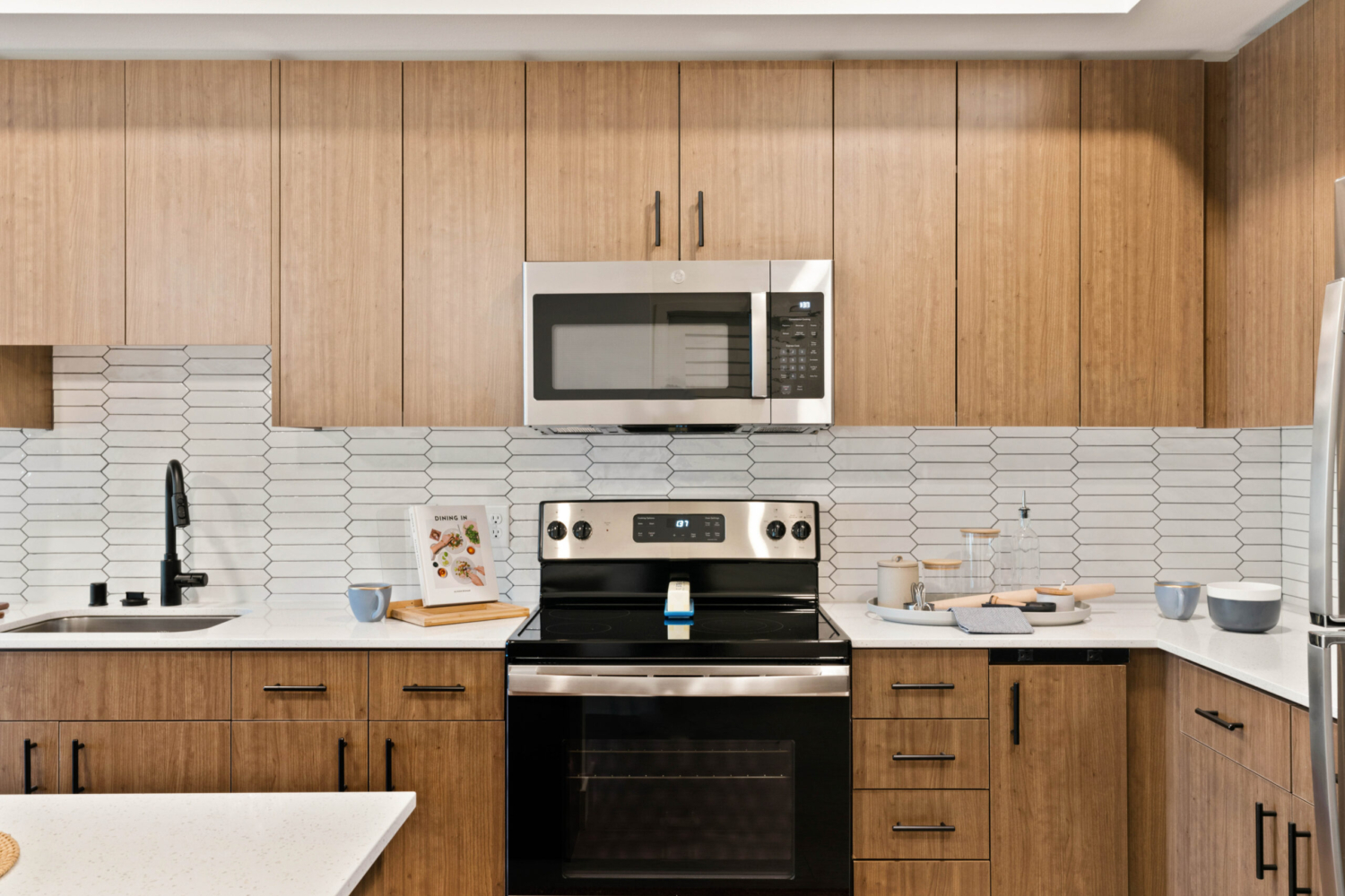 First, take a tour of our stylish and modern apartment interiors, complete with designer light fixtures, soft-close cabinets, stainless steel appliances, quartz countertops, modern tile backsplashes, and matte black accents. You’ll also appreciate the convenience of triple pane tilt-in windows, integrated air conditioning, and luxury vinyl wood-like flooring. And, with a large washer and dryer included in every unit, doing laundry has never been easier.